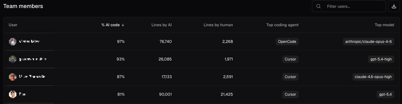 Get the usage breakdown for every developer on your team: % of AI code, preferred tool and model.